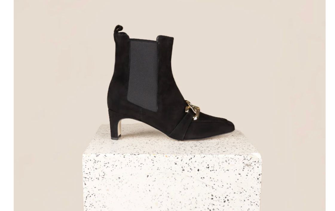 Introducing the new Alice. This sophisticated ankle boot is crafted from rich black suede, known for its soft texture and elegant matte finish. The design features a square toe, elastic side panels for effortless wear, and a chic gold chain. The deep black color enhances the boot’s versatility, making it an excellent choice for both day and night ensembles. The suede material offers a luxurious feel and a stylish contrast to the sleek metallic accent.