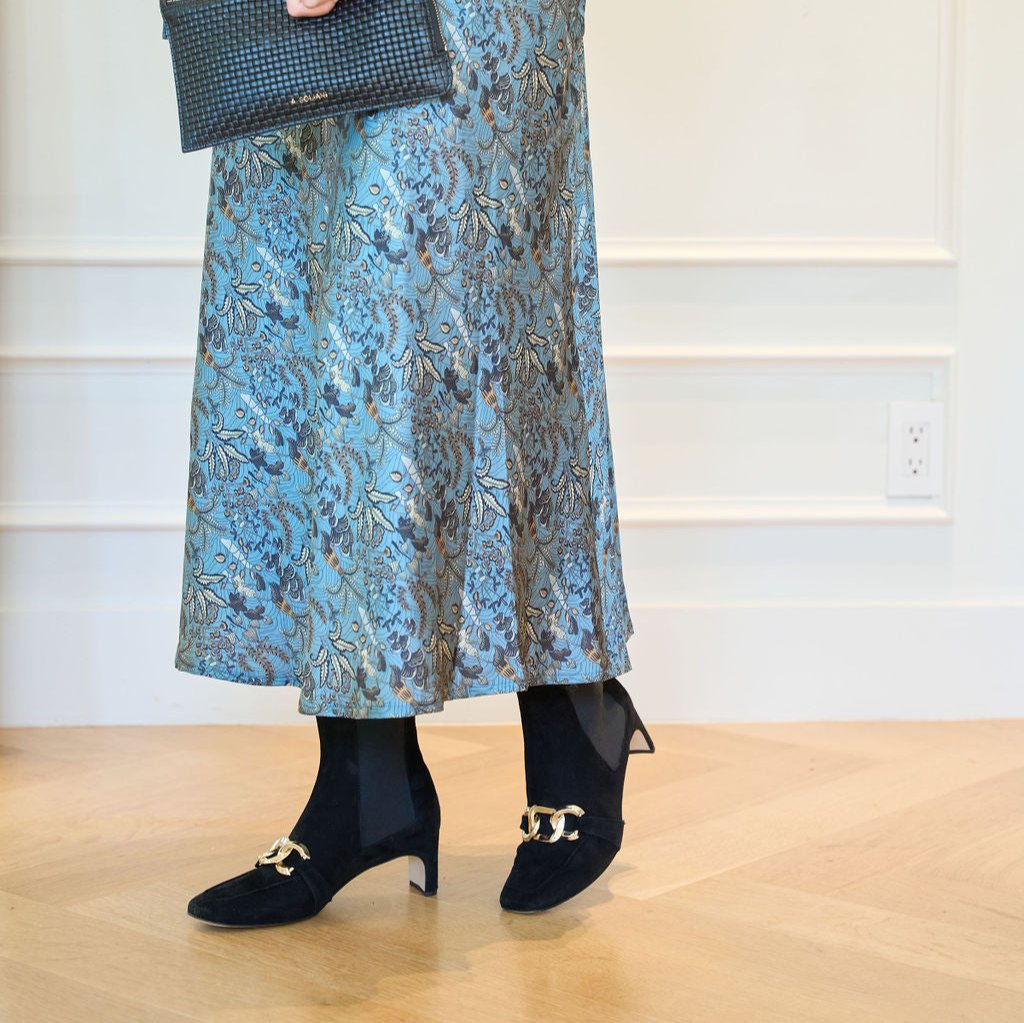 Introducing the new Alice. This sophisticated ankle boot is crafted from rich black suede, known for its soft texture and elegant matte finish. The design features a square toe, elastic side panels for effortless wear, and a chic gold chain. The deep black color enhances the boot’s versatility, making it an excellent choice for both day and night ensembles. The suede material offers a luxurious feel and a stylish contrast to the sleek metallic accent.