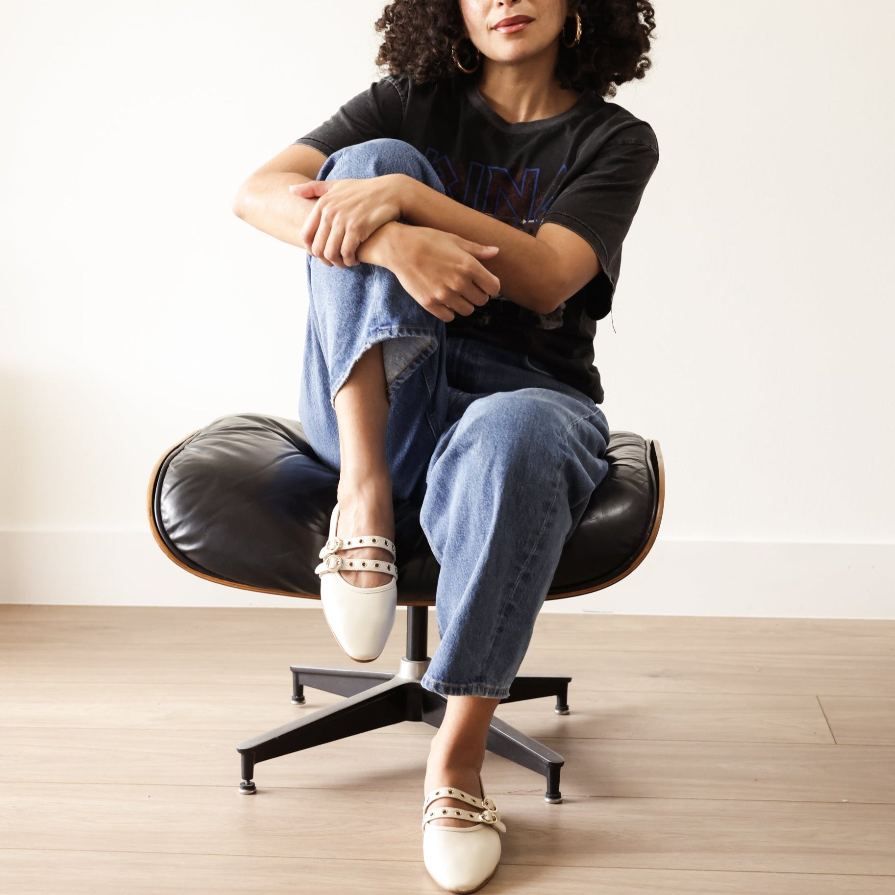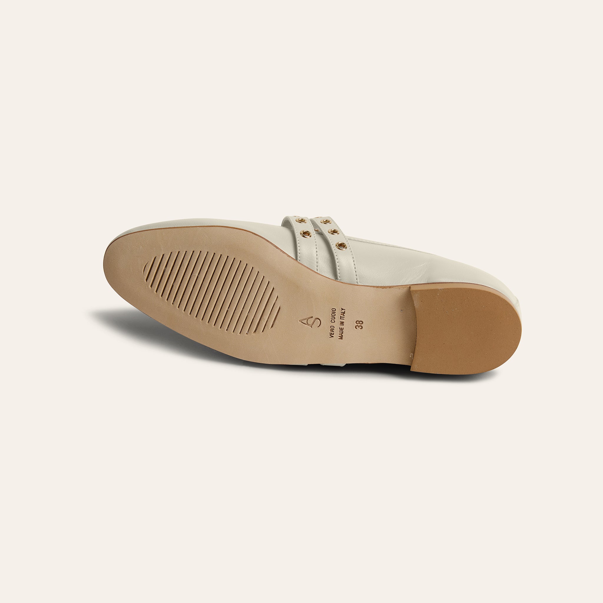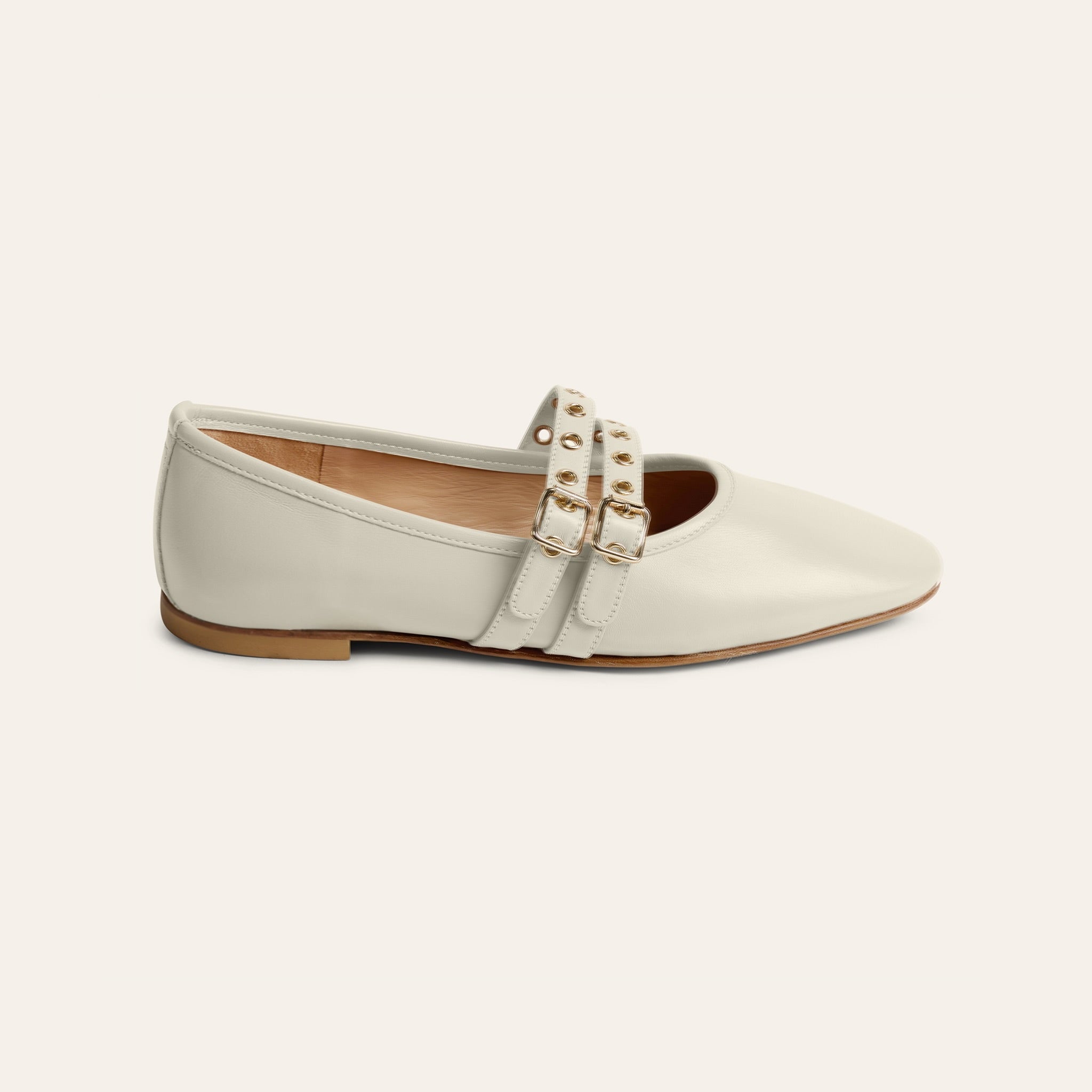 With its slightly elongated toe and slim, elegant shape, this timeless ballerina is designed to subtly lengthen the leg and elevate everyday dressing. The double buckle detail adds a polished, distinctive touch while maintaining a classic, effortless feel.