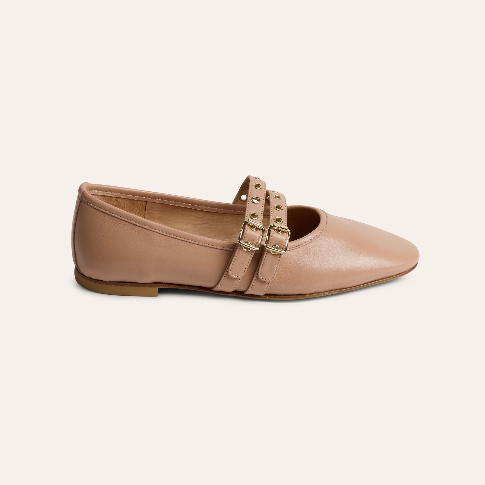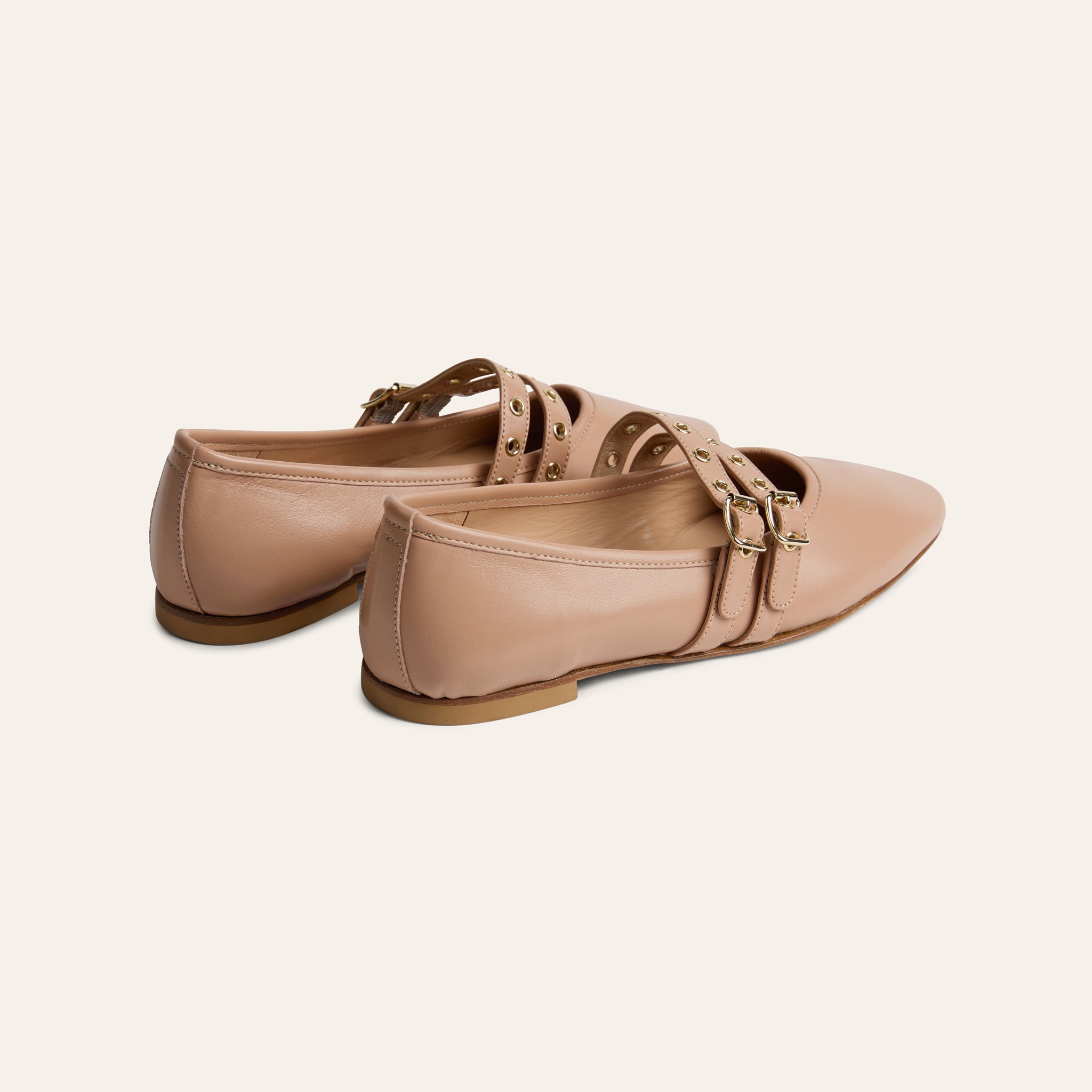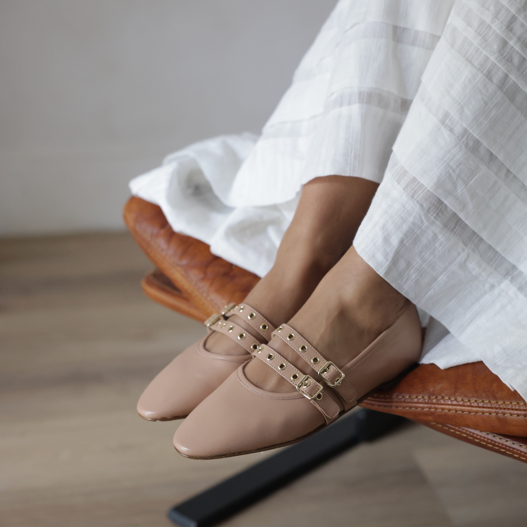 With its slightly elongated toe and slim, elegant shape, this timeless ballerina is designed to subtly lengthen the leg and elevate everyday dressing. The double buckle detail adds a polished, distinctive touch while maintaining a classic, effortless feel.