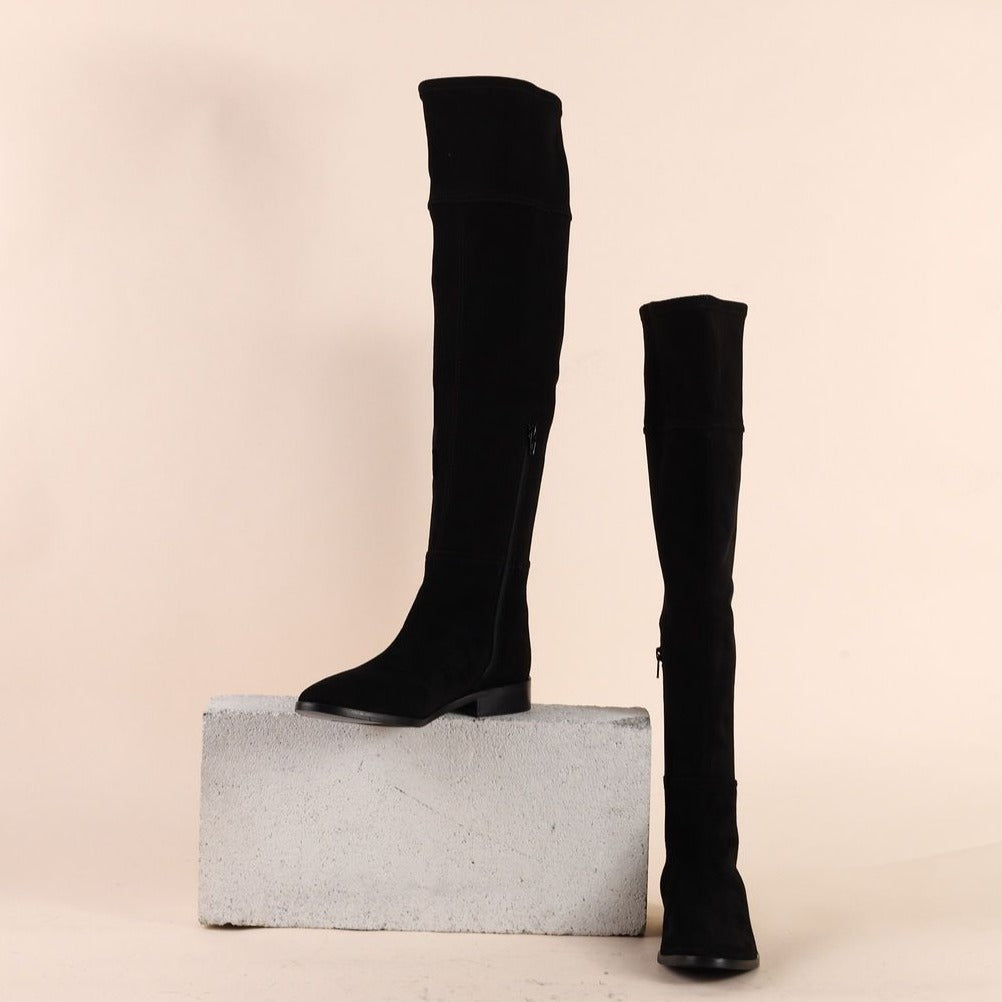 Smooth and luxurious, the Pisa features an over-the knee shaft crafted entirely from stretch suede to ensure a perfect, flawless fit. With a softly rounded toe, a small heel, and a side zip for easy wear, the Pisa is warm and comfortable classic. Wear them over washed jeans and under floaty dresses.
